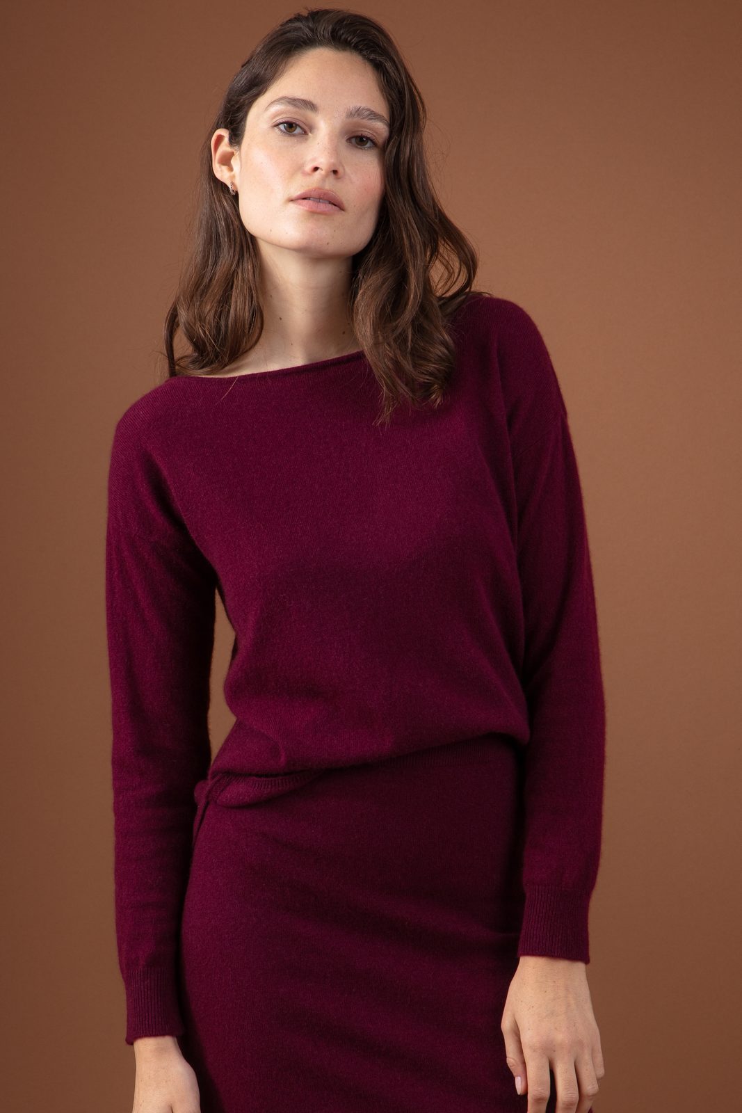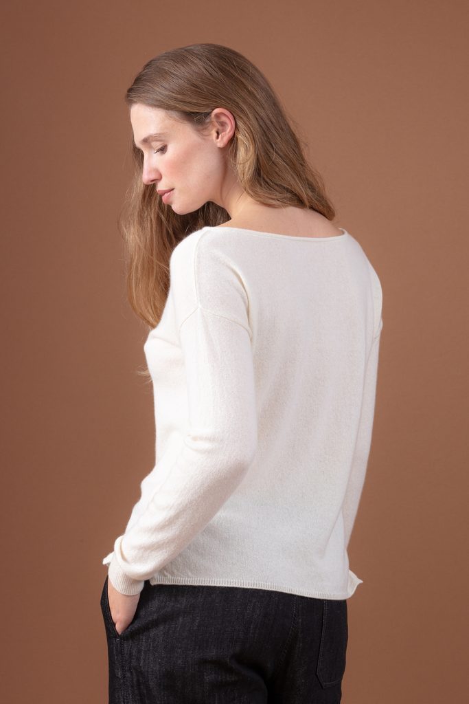 Original and feminine, the ROWENA jumper stands out with its reversible design: one side features a V-neck with a detail tie design, the other a simple and elegant boat neckline.